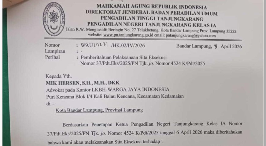 Langkah tegas ini dilakukan setelah terbitnya Surat Pemberitahuan Pelaksanaan Sita Eksekusi tertanggal 8 April 2026. Eksekusi dijadwalkan berlangsung pada Rabu, 15 April 2026.